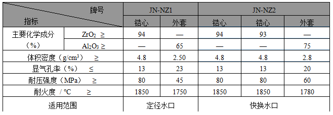 ·JN系列快換水口、定徑水口主要理化指標(biāo)·